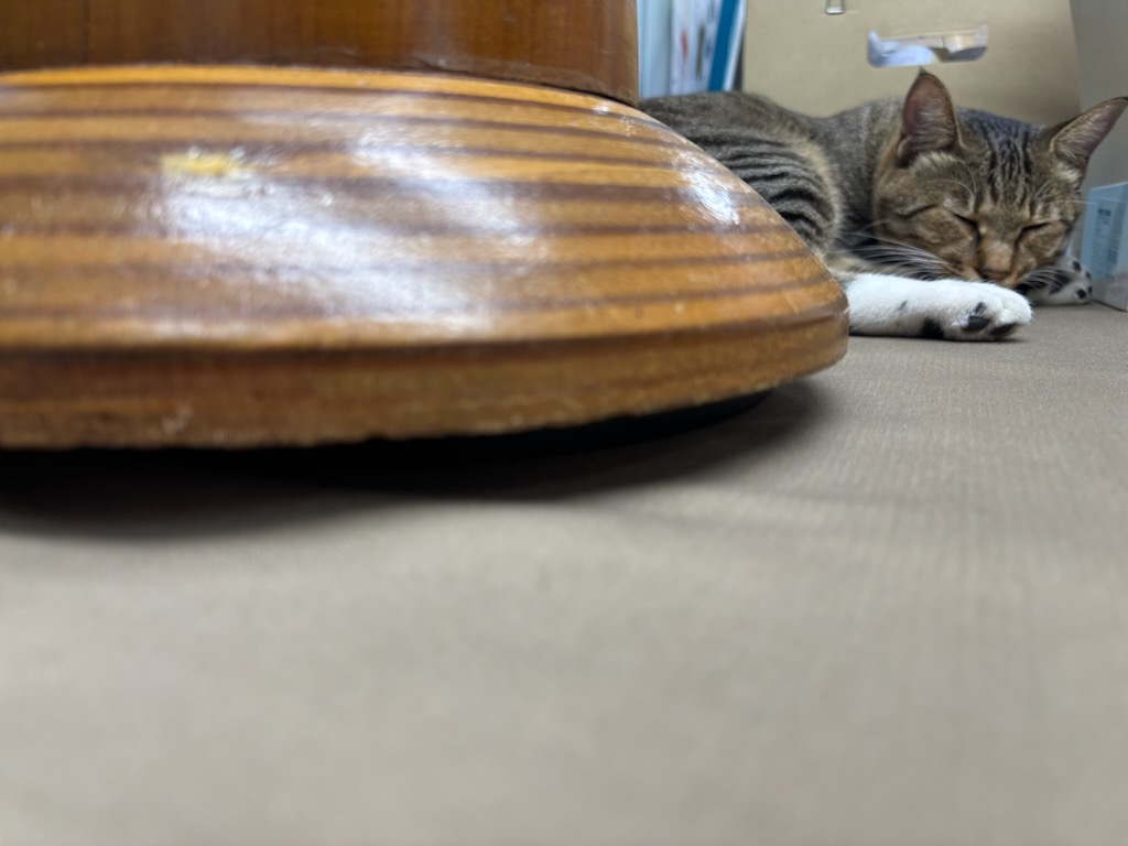 机に置いてある道具類をぐいぐい押しのけながら熟睡しています。
